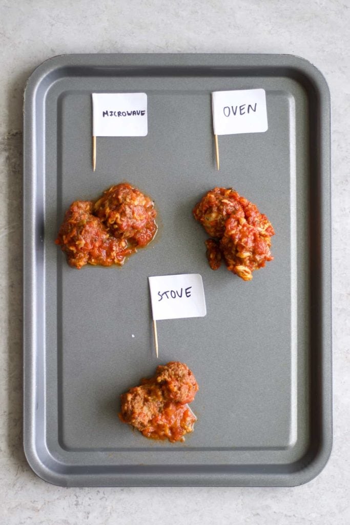 The following day, I tested three different ways of reheating the sauced meatballs and five different ways of reheating the plain, unsauced meatballs.